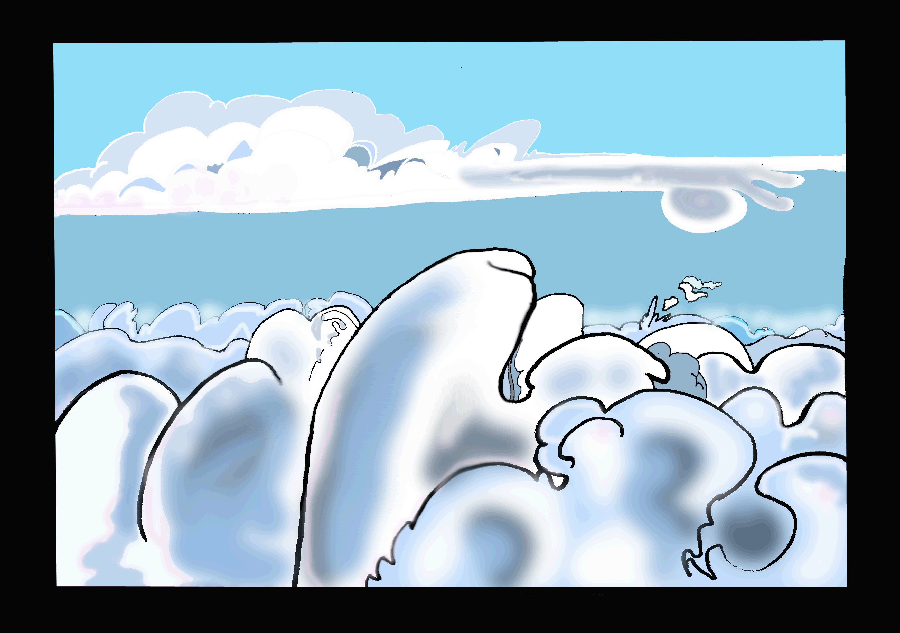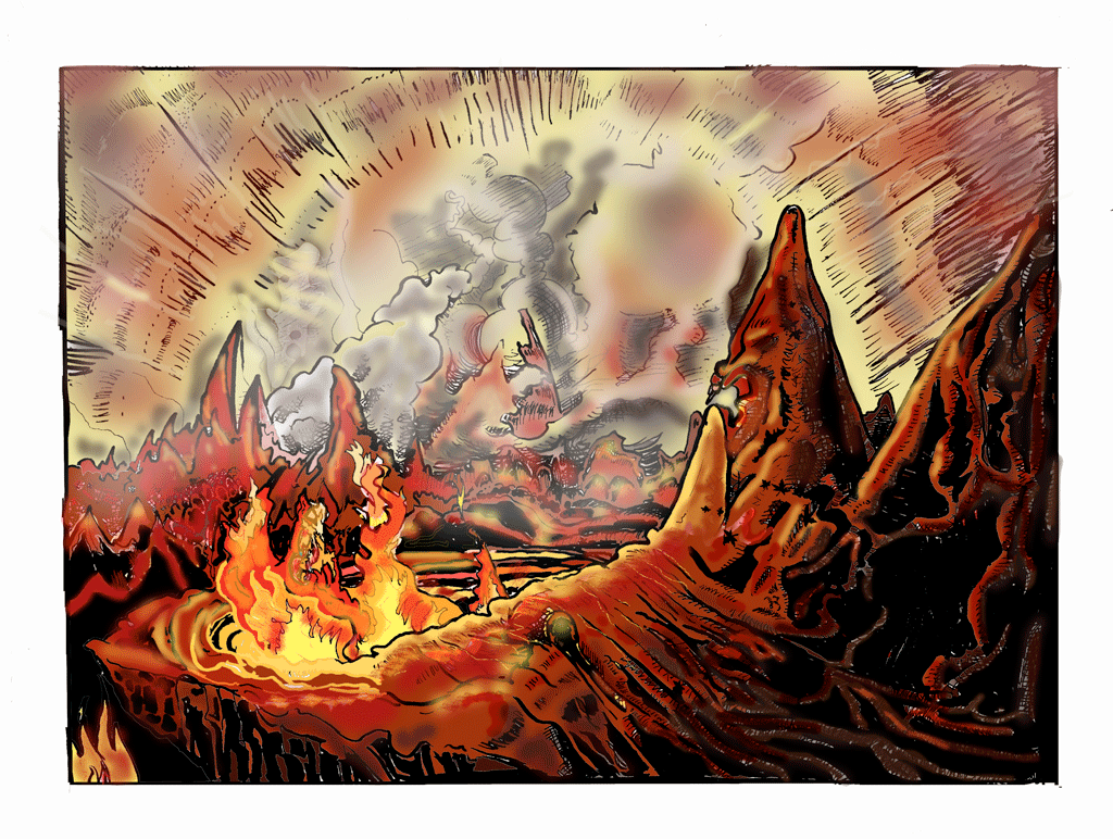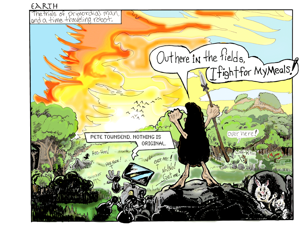 The color pieces are meant to be a progression of images of "earth" as we spiral into the setting for the strip. Ideally, these would serve as the Sunday 'toons for the first six weeks.